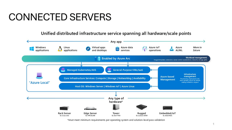 - 2024: Azure Local Unterstützt nicht mehr nur klassische IT-Workloads, sondern auch moderne, Cloud-native Dienste wie VMs, Azure Virtual Desktop (AVD), Azure Kubernetes Service (AKS), Datenbanken und Machine Learning – alles lokal.